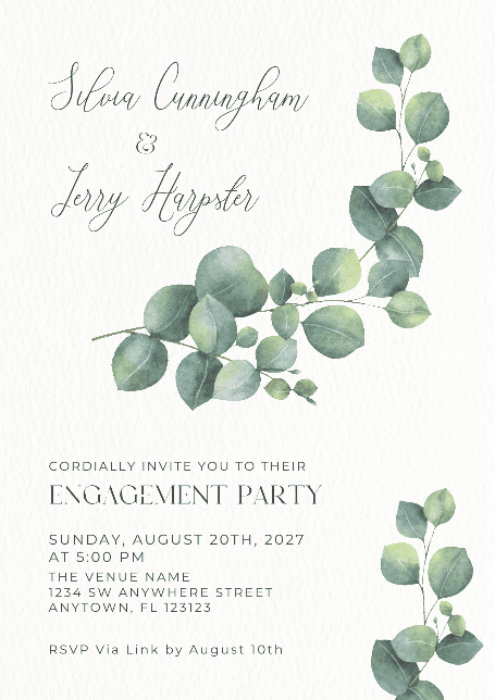 Denne invitation til forlovelsesfest indeholder en smuk akvarel botanisk illustration af eukalyptusgrene, der tilføjer et strejf af natur og friskhed til designet. Det delikate grønne skaber en subtil og romantisk stemning, ideel til at fejre kærlighed og engagement. Den bløde farvepalette og kunstneriske gengivelse gør denne invitation til et dejligt minde for gæsterne, og sætter tonen for en glædelig og stilfuld fest. Ideel til en naturinspireret eller botanisk tema forlovelsesfest.