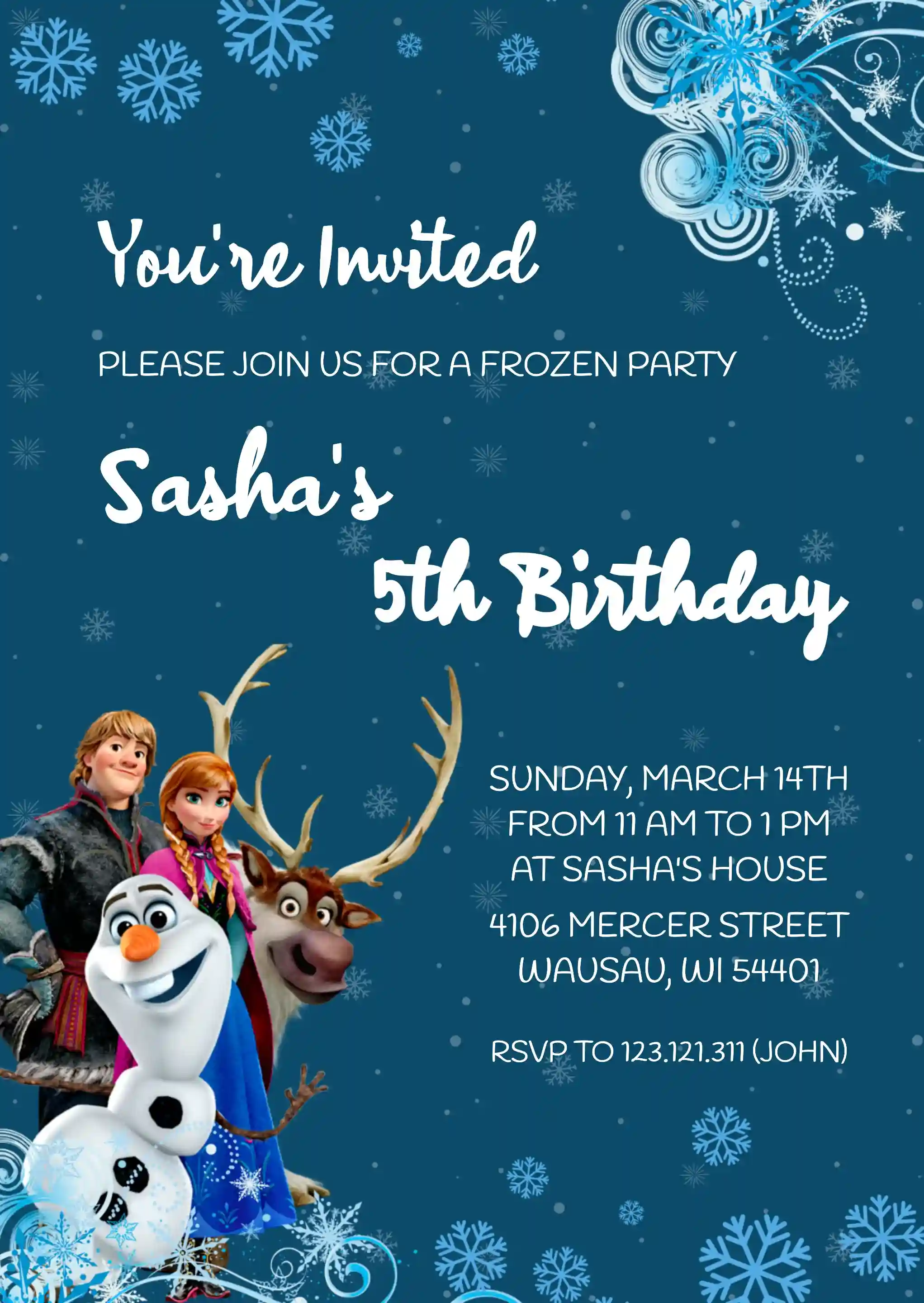 Die Einladung zeigt beliebte Charaktere aus dem Film, was ihren Charme und ihre Anziehungskraft für Kinder erhöht. Die Charaktere sind lebhaft dargestellt und verleihen dem Design ein Gefühl von Vertrautheit und Aufregung. Die Typografie ist spielerisch und lesbar, mit einer Mischung aus Schriftarten, die das Gesamtthema ergänzen. Diese Einladung ist ideal für alle, die eine magische und unvergessliche Winterparty veranstalten möchten und allen Gästen ein herrliches Erlebnis garantiert.